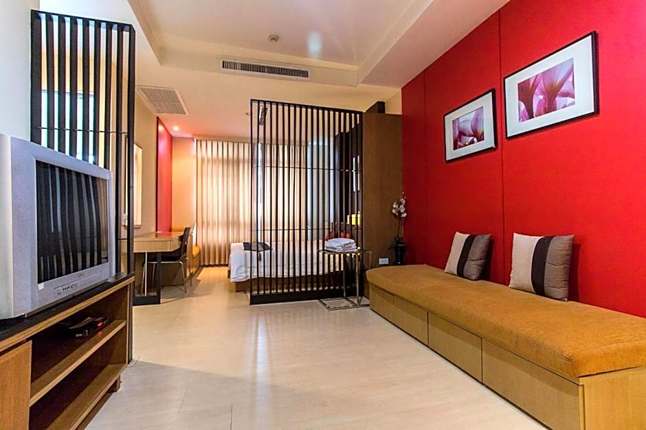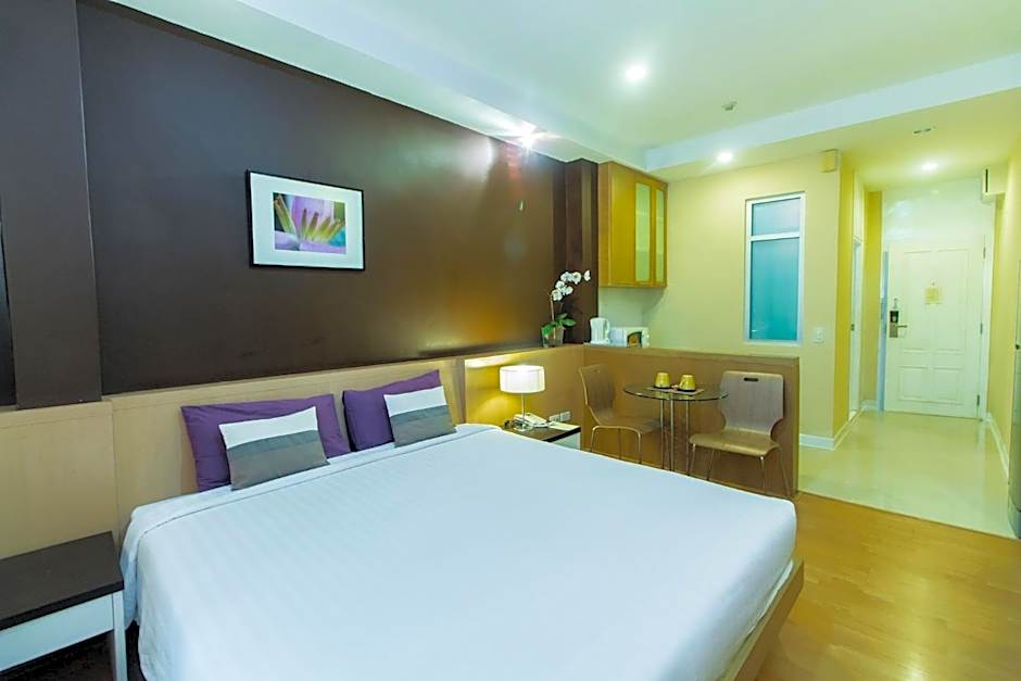 A spacious studio with a large private balcony offering great views of the city and green surroundings. It has a luxurious bathroom equipped with a bathtub and rainshower facilities.